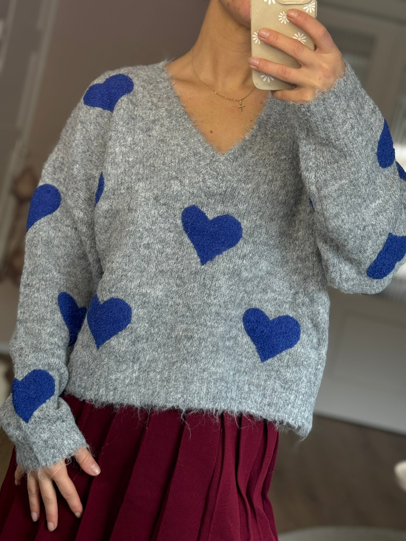 Hoe leuk is deze trui?! Mooie zachte trui met blauwe hartjes erop.