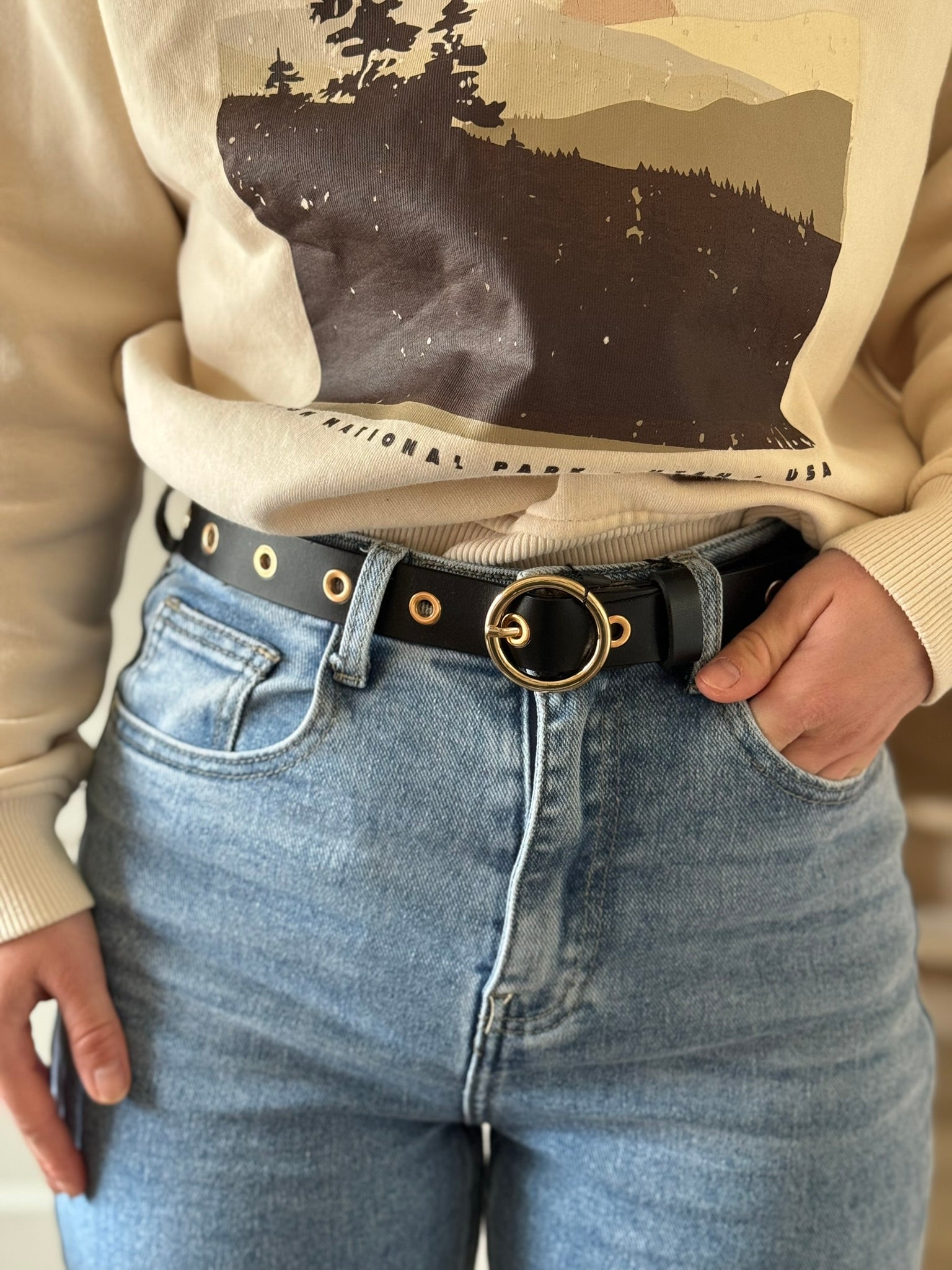 Leren riem met goudkleurige ringen - Zwart