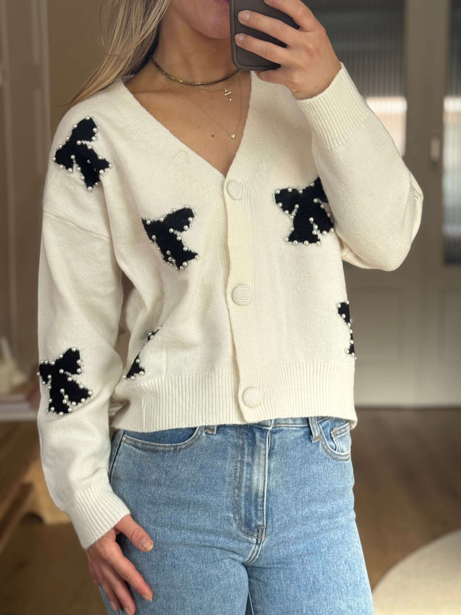 Hoe schattig is dit vest!! Het vest is crème kleurig en heeft aan de voorzijde zwarte strikjes met parels eromheen.