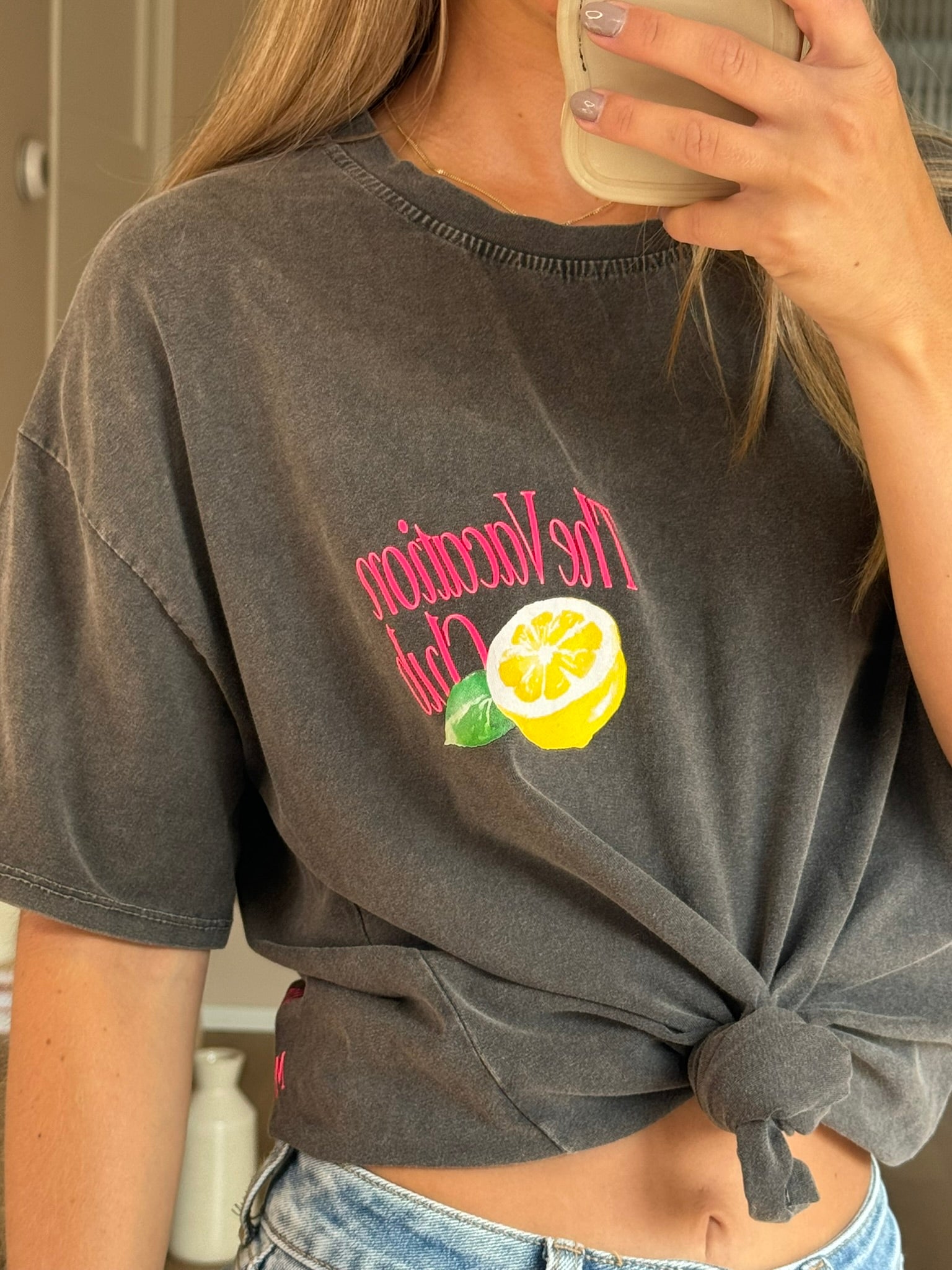 Mooi donkergrijs shirtje met 'The vacation club' op de borst en achterkant. Het shirtje heeft een oversized fit.